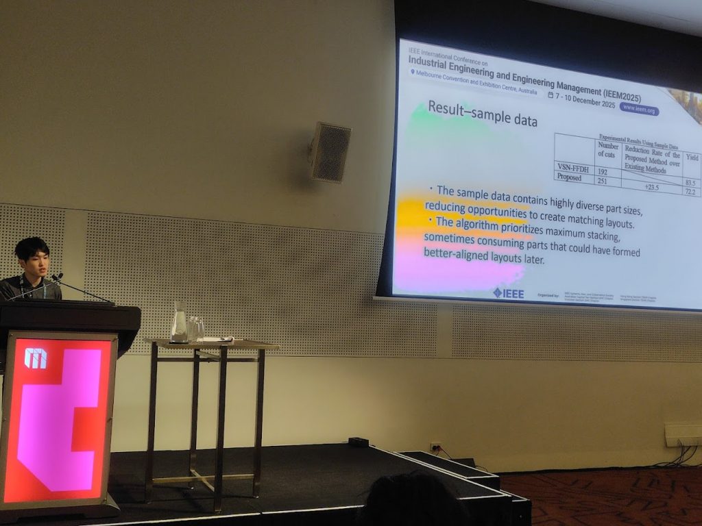 M1の木内君と西口君がIEEM2025発表をしました.タイトルは木内君が「Development and Usability Evaluation of an AR-Based Assembly Support System」,西口君が「Study on Reducing Cuts in the 2D Cutting Stock Problem」です.